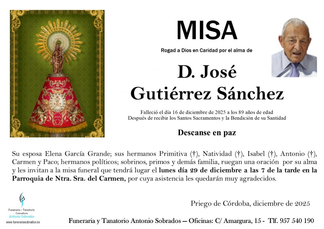 Misa Funeral de José Gutiérrez Sánchez Que falleció el 16 de diciembre de 2025 a los 89 años de edad. La misa se celebra el lunes, 29 de diciembre de 2025 a las 19:00 en Parroquia de Ntra. Sra. del Carmen (Priego de Córdoba)