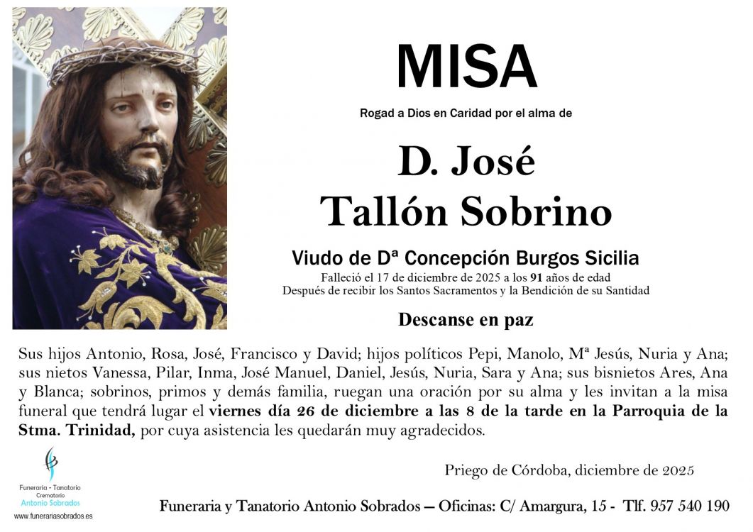 MISAS FUNERAL Misa Funeral de José Tallón Sobrino Que falleció el 17 de diciembre de 2025 a los 91 años de edad. La misa se celebra el viernes, 26 de diciembre de 2025 a las 20:00 en Parroquia de la Stma. Trinidad de Priego de Córdoba
