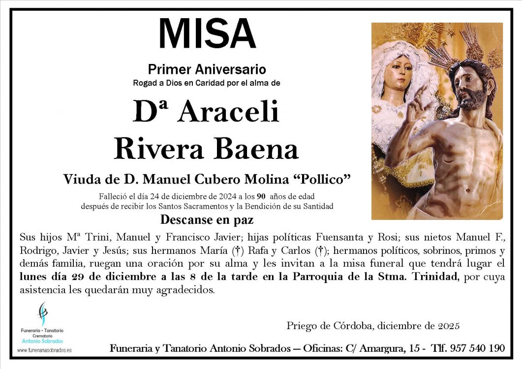 Misa Funeral de Araceli Rivera BAena Que falleció el 24 de diciembre de 2024 a los 90 años de edad. La misa se celebra el lunes, 29 de diciembre de 2025 a las 20:00 en Parroquia de la Stma. Trinidad de Priego de Córdoba