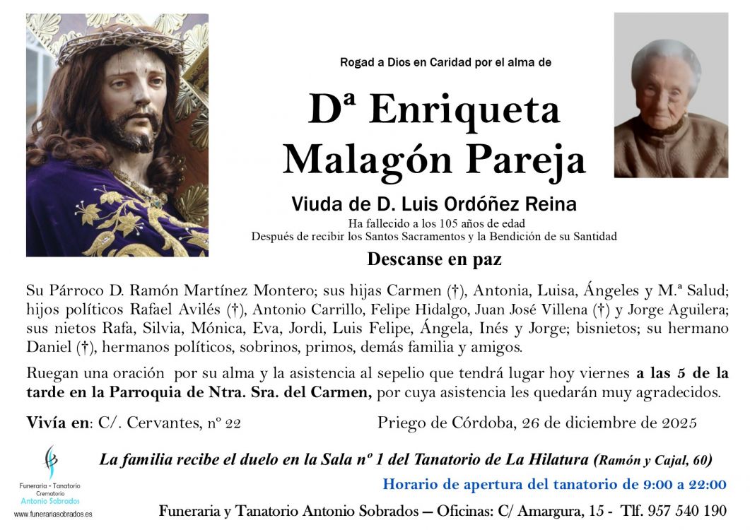 ESQUELAS Entierro de Enriqueta Malagón Pareja Que falleció el jueves, 25 de diciembre de 2025 a los 105 años de edad. Sepelio viernes, 26 de diciembre de 2025 a las 17:00 en Parroquia de Ntra. Sra. del Carmen (Priego de Córdoba)