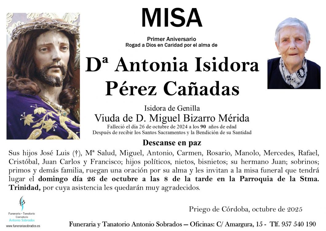 Misa Funeral de Antonia Isidora Pérez Cañadas Que falleció el 26 de octubre de 2024 a los 90 años de edad. La misa se celebra el domingo, 26 de octubre de 2025 a las 20:00 en Parroquia de la Stma. Trinidad de Priego de Córdoba
