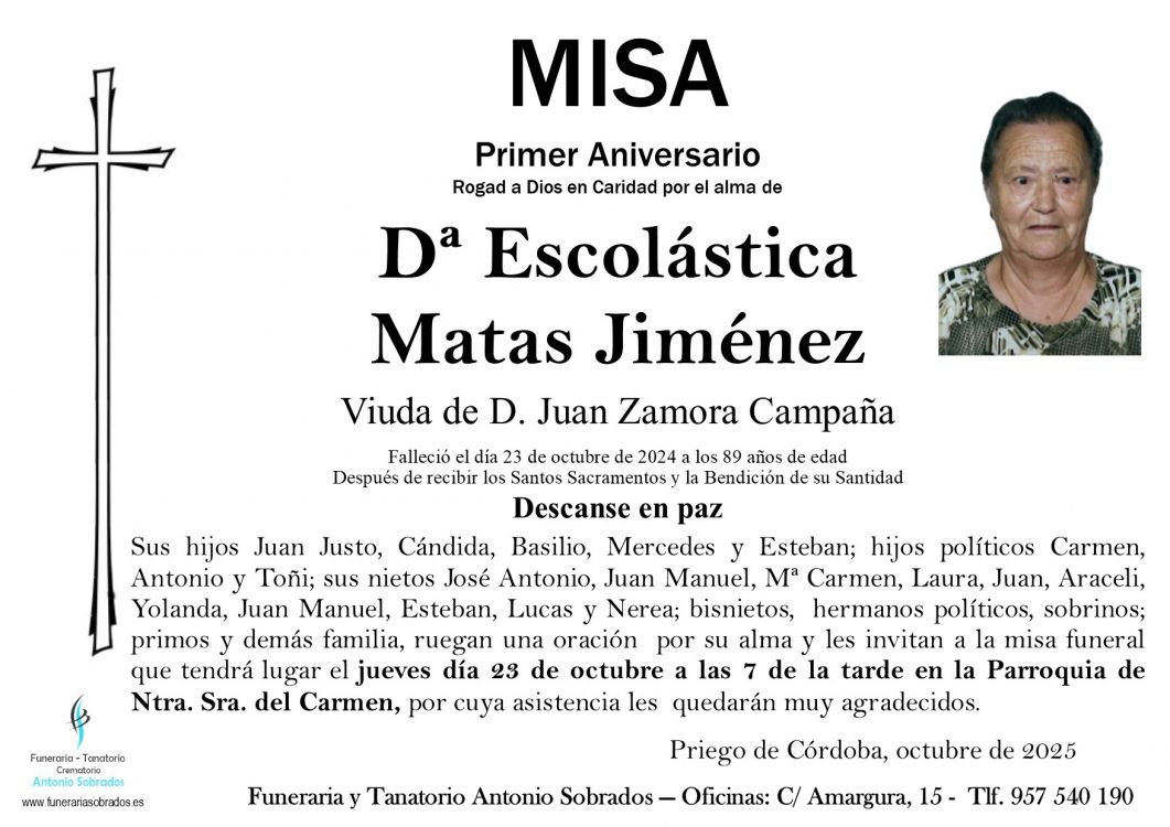 Misa Funeral de Escolástica Matas Jiménez Que falleció el 23 de octubre de 2024 a los 89 años de edad. La misa se celebra el jueves, 23 de octubre de 2025 a las 19:00 en Parroquia de Ntra. Sra. del Carmen (Priego de Córdoba)