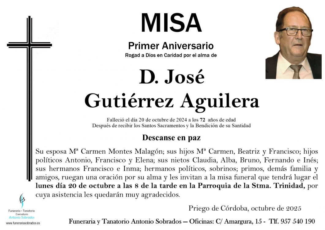 Misa Funeral de José Gutiérrez Aguilera Que falleció el 20 de octubre de 2024 a los 72 años de edad. La misa se celebra el lunes, 20 de octubre de 2025 a las 20:00 en Parroquia de la Stma. Trinidad de Priego de Córdoba