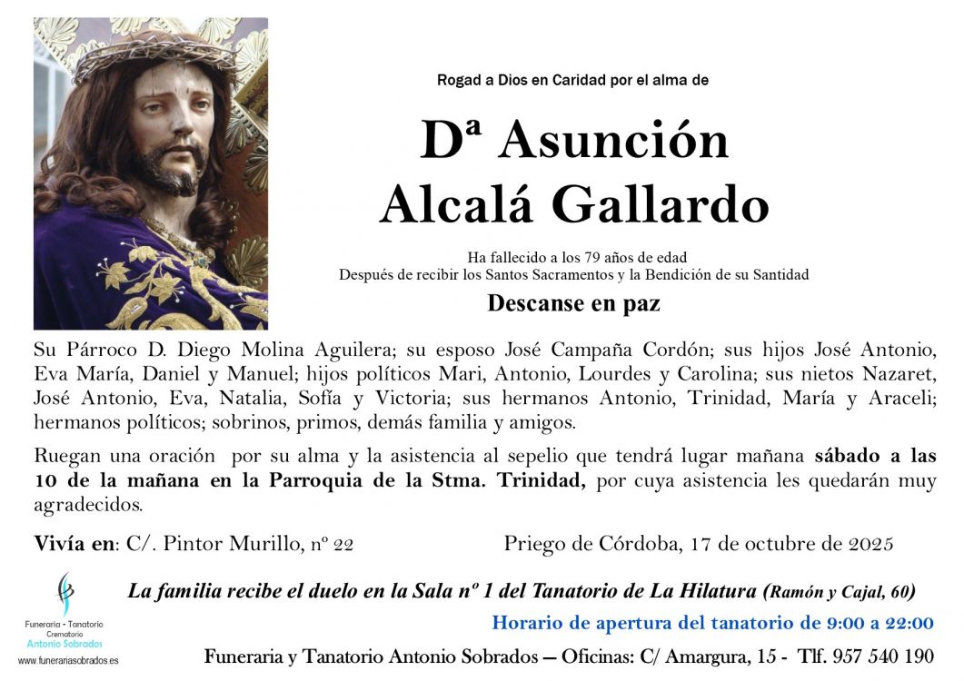 ESQUELAS Entierro de Asunción Alcalá Gallardo Que falleció el viernes, 17 de octubre de 2025 a los 79 años de edad. Sepelio sábado, 18 de octubre de 2025 a las 10:00 en Parroquia de la Stma. Trinidad de Priego de Córdoba