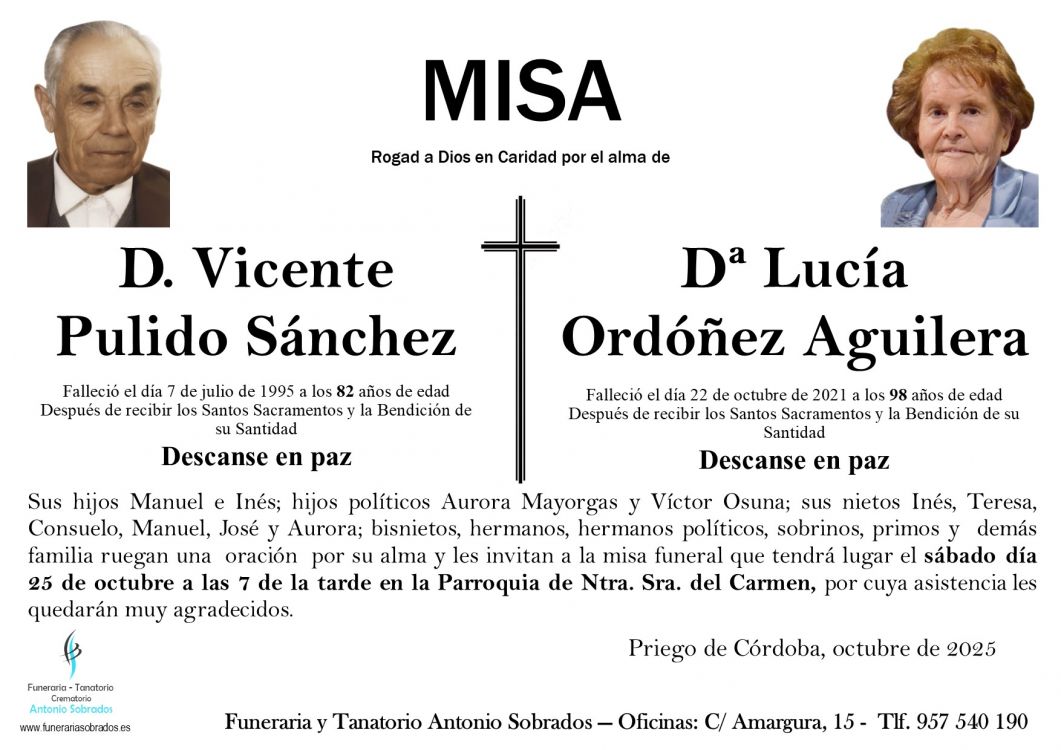 Misa Funeral de Vicente Pulido Sánchez Que falleció el 07 de julio de 1995 a los 82 años de edad. La misa se celebra el sábado, 25 de octubre de 2025 a las 19:00 en Parroquia de Ntra. Sra. del Carmen de Priego de Córdoba