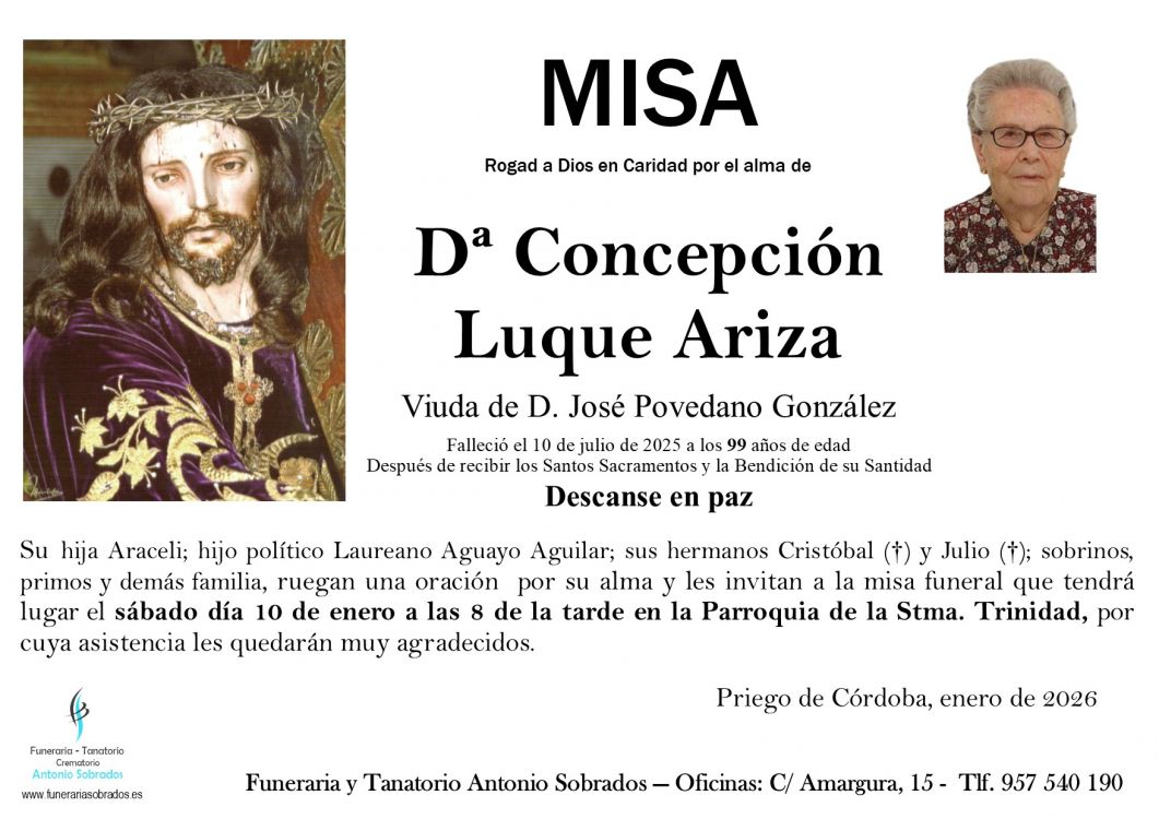 Misa Funeral de Concepción Luque Ariza Que falleció el 10 de julio de 2025 a los 99 años de edad. La misa se celebra el sábado, 10 de enero de 2026 a las 20:00 en Parroquia de la Stma. Trinidad de Priego de Córdoba