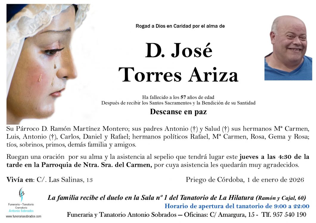 ESQUELAS Entierro de josé Torres Ariza Que falleció el miércoles, 31 de diciembre de 2025 a los 57 años de edad. Sepelio jueves, 01 de enero de 2026 a las 16:30 en Parroquia de Ntra. Sra. del Carmen (Priego de Córdoba)
