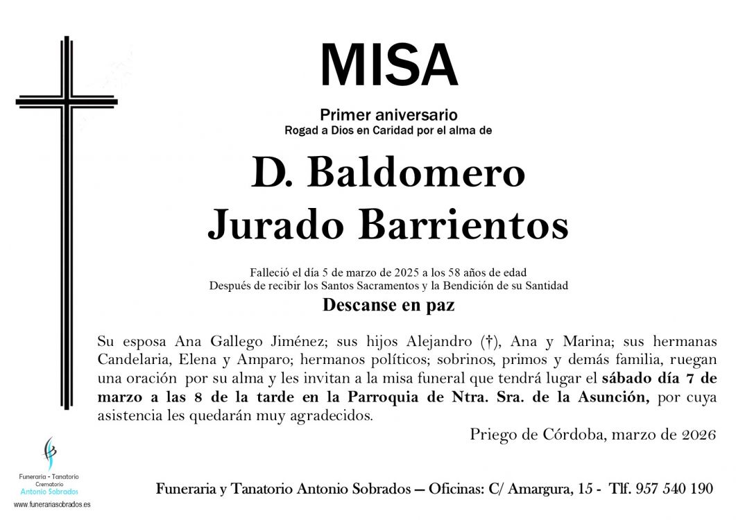 Ver esquela Misa Funeral de Baldomero Jurado Barrientos Que falleció el 05 de marzo de 2025 a los 58 años de edad. La misa se celebra el sábado, 07 de marzo de 2026 a las 20:00 en Parroquia de Ntra. Sra. de la Asunción (Priego de Córdoba)