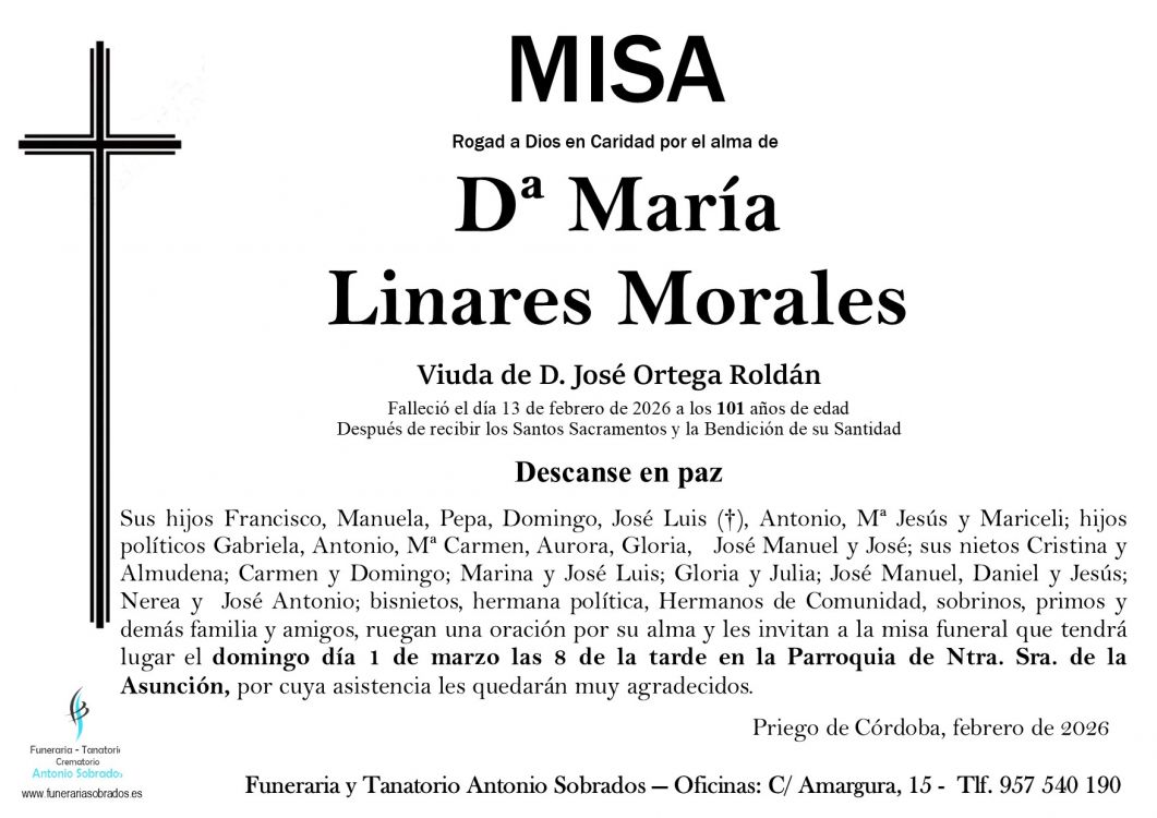 MISAS FUNERALMisa Funeral de María Linares Morales Que falleció el 13 de febrero de 2026 a los 101 años de edad. La misa se celebra el domingo, 01 de marzo de 2026 a las 20:00 en Parroquia de Ntra. Sra. de la Asunción (Priego de Córdoba)