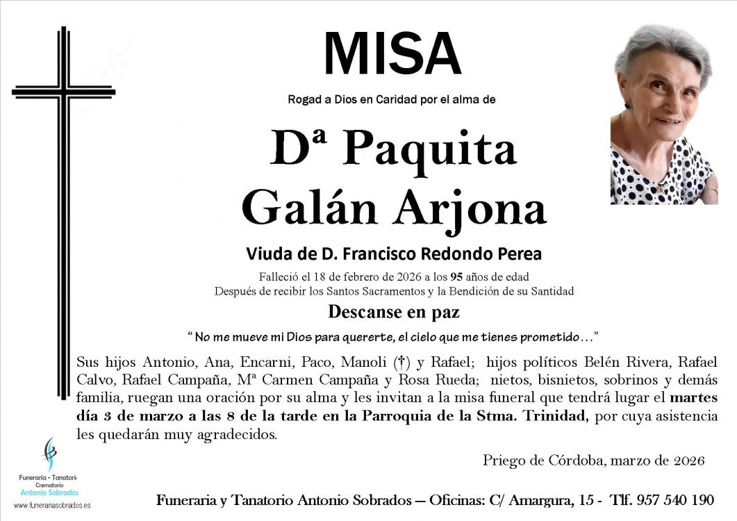 Ver esquela Misa Funeral de Paquita Galán Arjona Que falleció el 18 de febrero de 2026 a los 95 años de edad. La misa se celebra el martes, 03 de marzo de 2026 a las 20:00 en Parroquia de la Stma. Trinidad de Priego de Córdoba