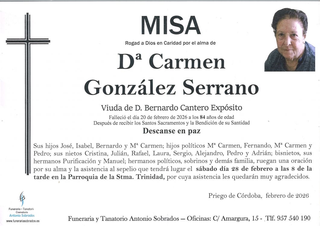 Ver esquela Misa Funeral de Carmen González Serrano Que falleció el 20 de febrero de 2026 a los 84 años de edad. La misa se celebra el sábado, 28 de febrero de 2026 a las 20:00 en Parroquia de la Stma. Trinidad de Priego de Córdoba